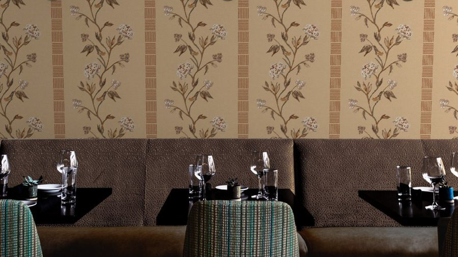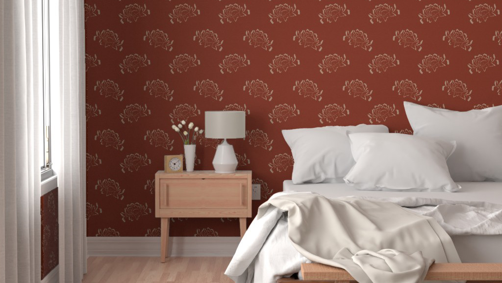 Small repetitive pattern of stylized leaves, reminiscent of the damask but more discreet, to create a soft visual rhythm.