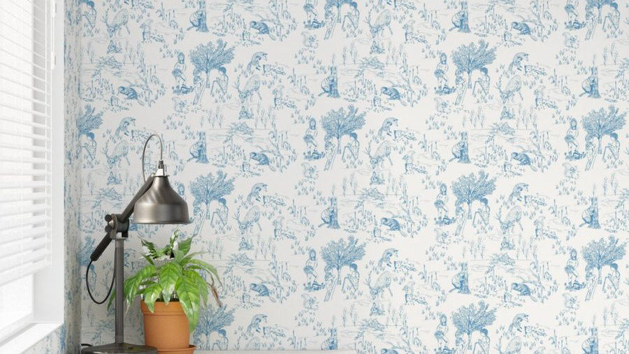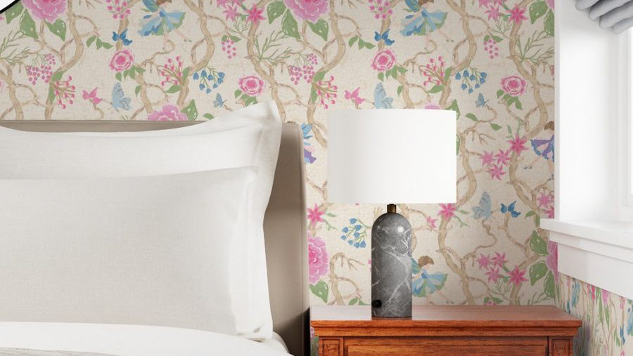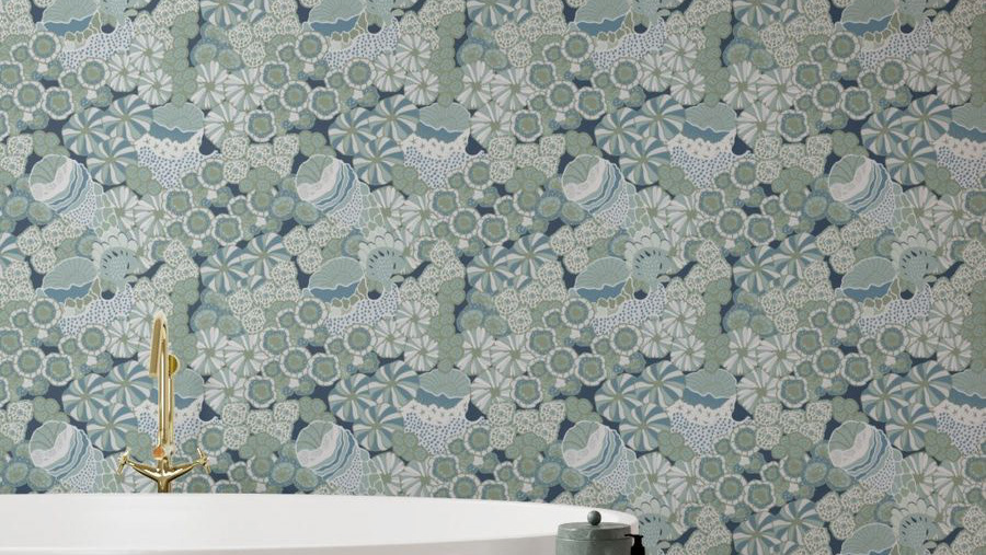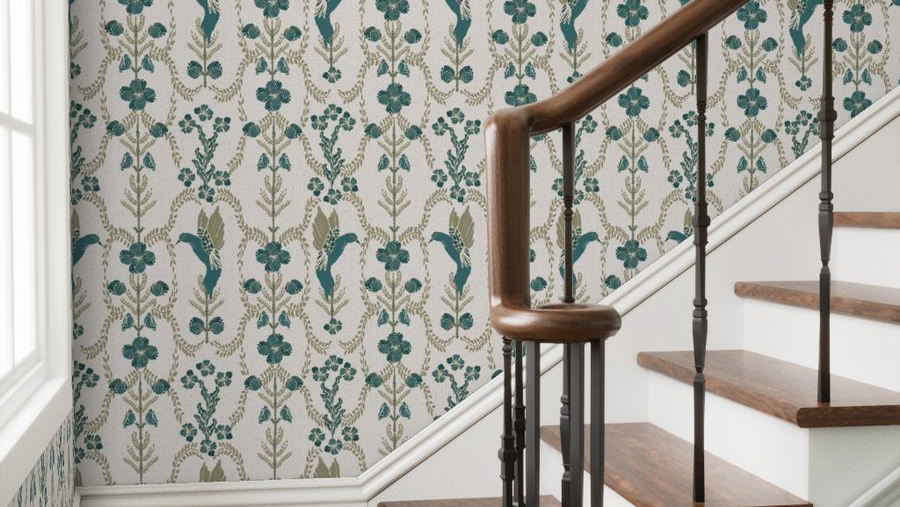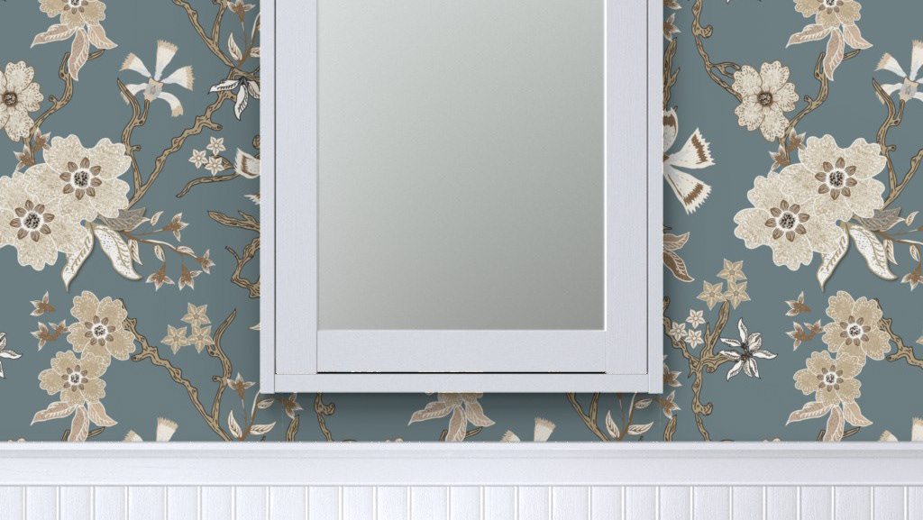 Simplified ogee pattern reminiscent of damask, tone-on-tone, to create a subtle visual link